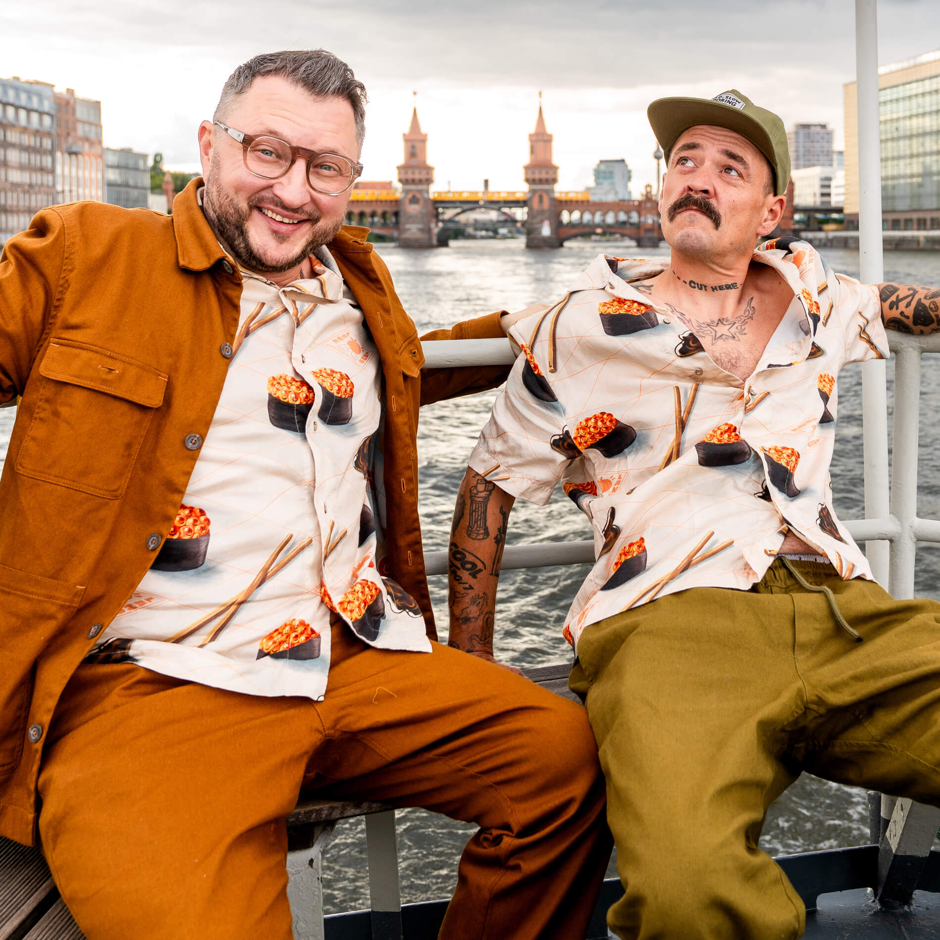 Multicolor hawaiian shirt premium line mit Shushi Design von mcbess. Unter dem "Scan Me"-Label findest du einen eingearbeitete NFC-Button, dieser zeigt Dir mit nur einer Berührung, welche Rezeptur und Materialien in Deinem Teil stecken – transparent und jederzeit abrufbar.